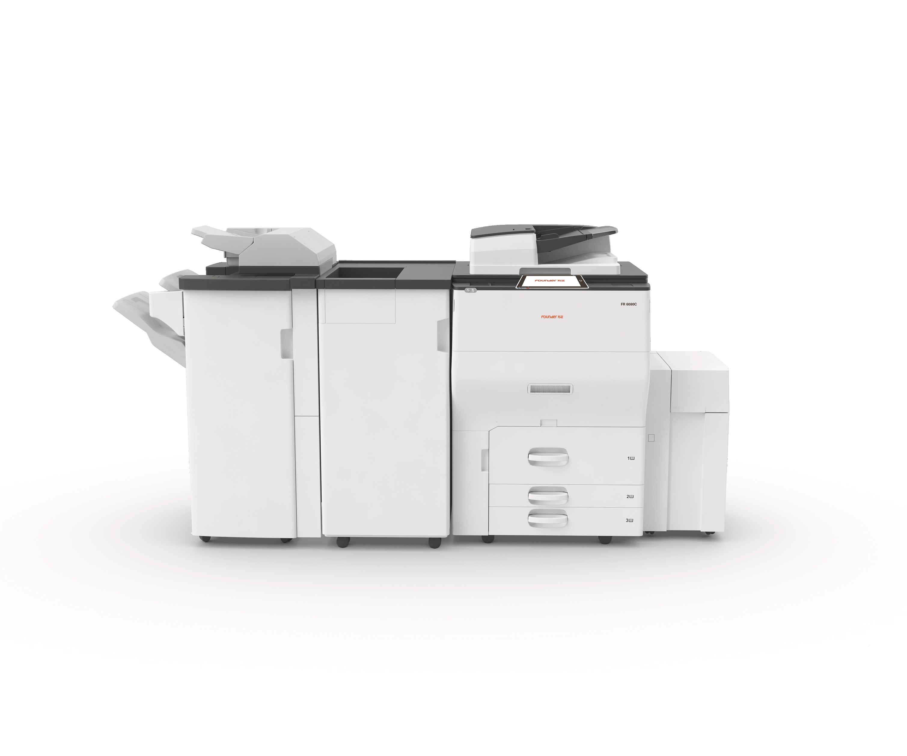 2.7强大的扫描功能:方正FR6080C彩色数码复印机,具备强大的扫描功能,标配220页双面同步自动进纸器,一次扫描可读取双面原稿的正反面,单面扫描速度高达120页每分钟,双面扫描速度高达220页每分钟, 扫描文件可以发送到U盘,SD卡,硬盘,文件夹或邮箱,堪比一台A3高速扫描仪。 2.8高性能:方正FR6080C是一台高性能彩色数码复印机,采用生产型设备的引擎技术,一次发射40束激光,月打印量高达15万页,达到生产型设备要求,首页输出时间黑白4.7秒,彩色6.3秒,标配3700页容量纸盒,可扩展到8100页,还可以将两台FR6080C串联,实现160页每分钟的高速连续输出,主机内备有副碳粉仓,确保碳粉瓶碳粉用尽时,也可使用副碳粉仓继续输出。 2.9扩展性强:方正FR6080C彩色数码复印机,充分考虑到日常办公需求,集打印,复印,扫描,网络,文件管理功能于一体;可选配小册子装订器,多功能折页器,打孔选购件,大容量纸盒,实现角钉,平钉,骑马钉的装订功能。